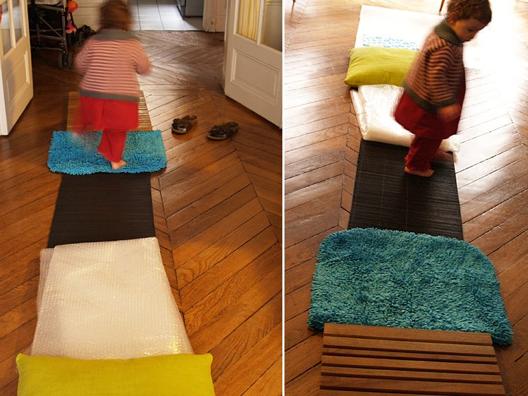 L’autre jour, j’ai expérimenté un nouveau jeu, le parcours sensoriel. Un peu comme à la gym mamans-bébés où on nous fabrique des parcours avec différents obstacles :