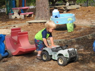 Quand les enfants ont fini d’explorer un jouet, ils trouvent encore des façon de continuer à tester le monde et les relations entre les objets, les personnes. Ici, les garçons ont passé des durs moments pour arriver à mettre leur gros, lourd et encombrant véhicule en hauteur dans le centre du petit bac à sable. Ils sont fiers de leur exploit, croyez-moi.