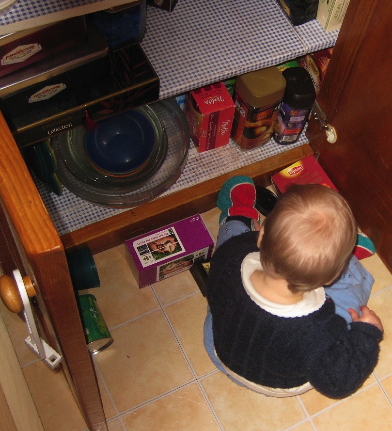 Dans la cuisine, je n’ai plus de petit placard à ma disposition avec ma petite vaisselle en plastique et des boîtes avec lesquelles je pouvais m’amuser. De toutes façon les placards sont fermés avec des aimants tellement puissants que maman elle même peine à les ouvrir.