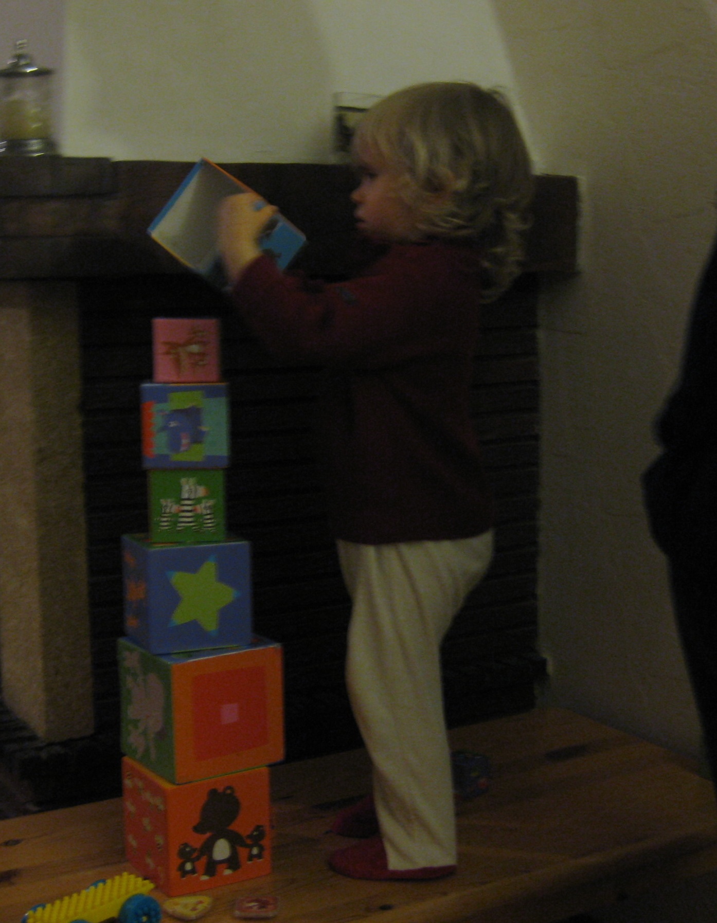 J’ai réussi à me faire tomber une des « marches » sur le pied, aussi Maman m’a-t-elle surveillée de près quand j’ai fait ma construction, ne me laissant pas aussi libre de mes mouvements que lorsque j’avais construit une tour avec des cubes en carton …